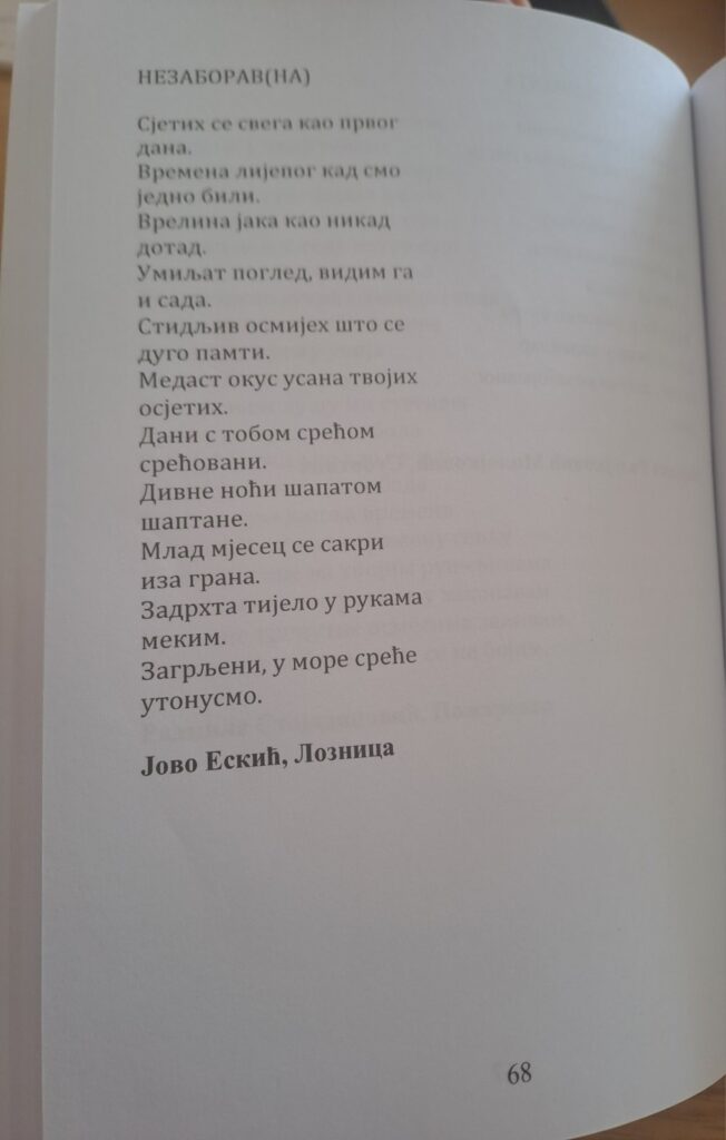 Наш пјесник Јово Ескић учествовао је на том конкурсу и његова пјесма ,,Незаборавна“ уврштена је и објављена у Зборнику поезије.